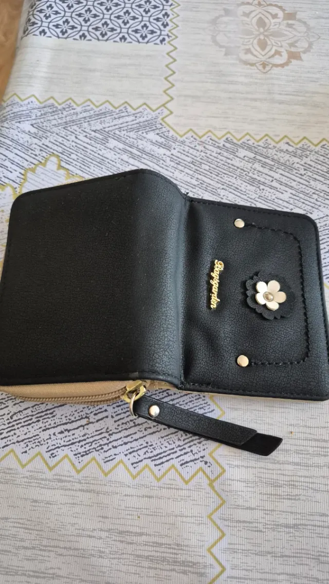 Billetera negra con detalles dorados