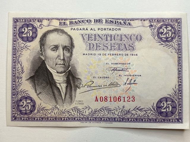 Billete de 25 pesetas del Banco de España, emitido en Madrid el 19 de febrero de 1946. Presenta un retrato de un personaje histórico. FLÓREZ ESTRADA.