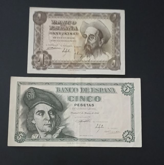 Conjunto de dos billetes antiguos del Banco de España. - Un billete de 1 peseta 1951, serie K - Un billete de 5 pesetas 1948, serie K. - Más billetes en mi perfil.