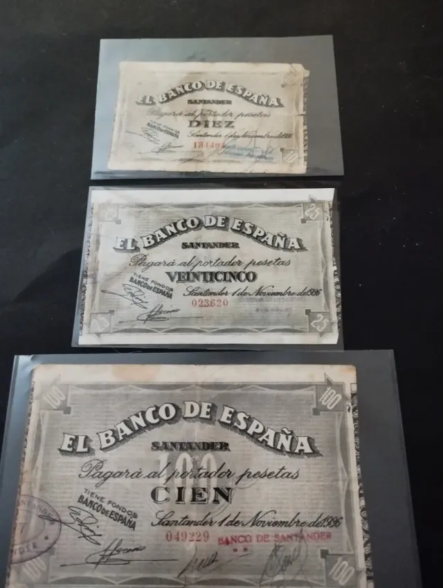 Conjunto de tres billetes antiguos Santander. - Billetes de 10, 25 y 100 pesetas. - Fechados en noviembre de 1936. - Con sellos y firmas originales.