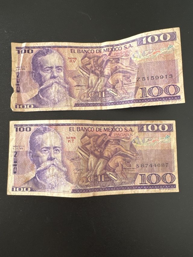 Detalles del productoPongo a la venta estos billetes antiguos de México. Son cuatro billetes en total: dos de 100 pesos, uno de 50 pesos y uno de 20 pesos. Los billetes muestran señales de desgaste por el paso del tiempo, pero se encuentran en buenas condiciones generales. - Dos billetes de 100 pesos. - Un billete de 50 pesos. - Un billete de 20 pesos.