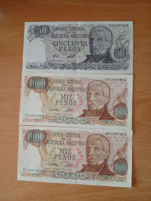 Conjunto de billetes de curso legal de Argentina. - Un billete de 50 Pesos. - Dos billetes de 1000 Pesos.