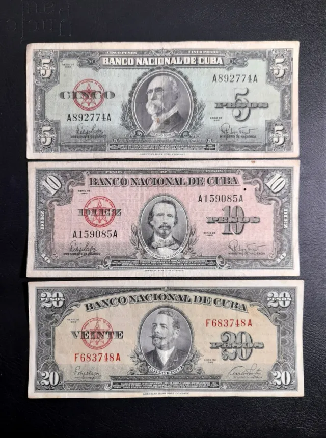 Detalles del productoConjunto de tres billetes cubanos circulados anteriores a la Revolución. Billetes de 5, 10 y 20 pesos.