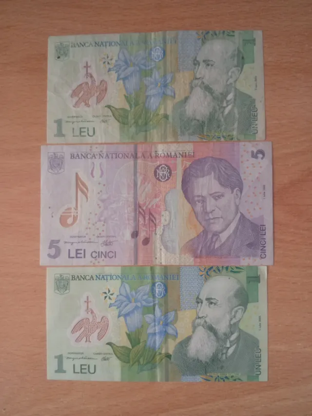 Conjunto de billetes de Leu Rumano. - Un billete de 1 Leu. - Un billete de 5 Lei. - Diseño con retratos y motivos florales.