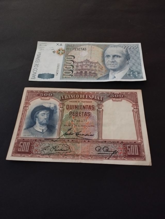 Dos billetes españoles antiguos, uno de 500 pesetas y otro de 10000 pesetas. - Billetes de colección. - Diseño detallado y conmemorativo.
