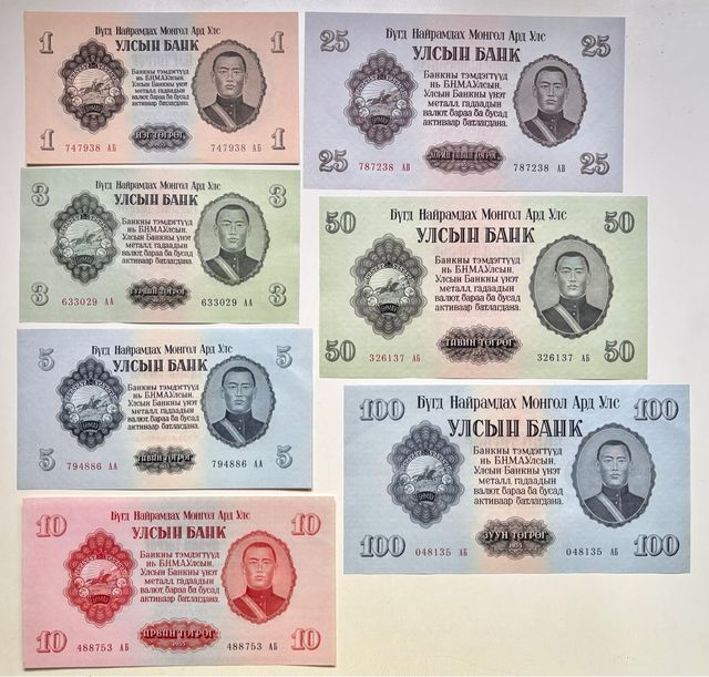 Detalles del productoLote / Set x7 billetes de 1, 3, 5, 10, 25, 50 y 100 Tugrik 1955 SC/SC-