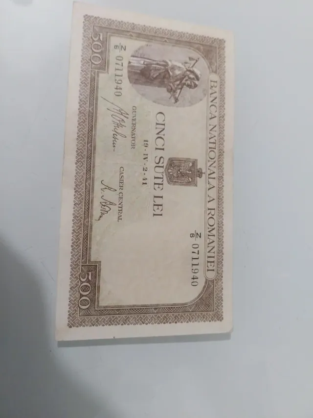 Billete de 500 Lei de Rumanía, emitido en 1941. - Denominación: 500 Lei. - Fecha de emisión: 19-IV-2-41. - Banco Nacional de Rumanía. - Número de serie: Z 0711940.