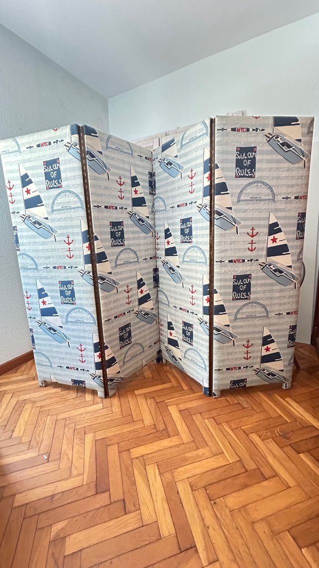 Detalles del productoPreciosa pantalla plegable de cuatro paneles. Ideal para separar ambientes o como elemento decorativo. - Está fabricada con una tela resistente de algodón. - El diseño náutico es elegante y atemporal. - Los paneles se pliegan fácilmente para facilitar su almacenamiento. - Se encuentra en muy buen estado. mise 1,5 mttos de alto x 4 mtrs de ancho. Medidas del producto