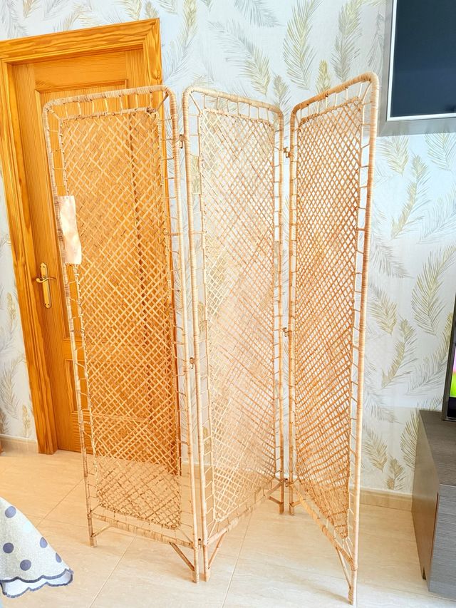 Detalles del productoPreciosa pantalla de tres paneles hecha a mano con ratán. Ideal para separar ambientes o como elemento decorativo.