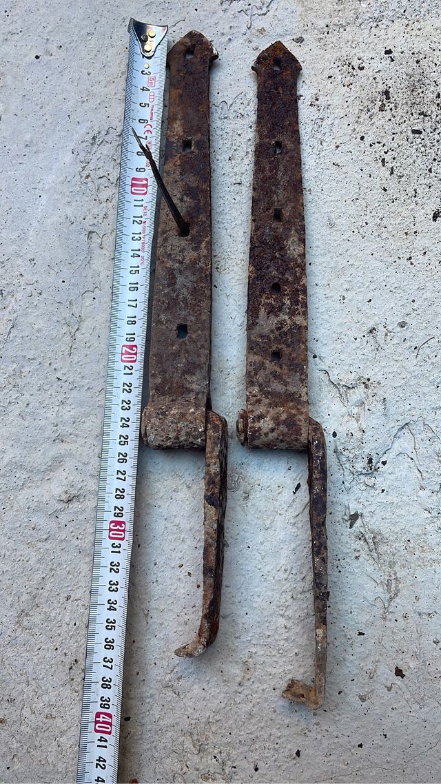 Conjunto de dos bisagras antiguas, procedentes de una masía del siglo XVI. Piezas con un marcado carácter histórico y rústico. para empotrar en pared.