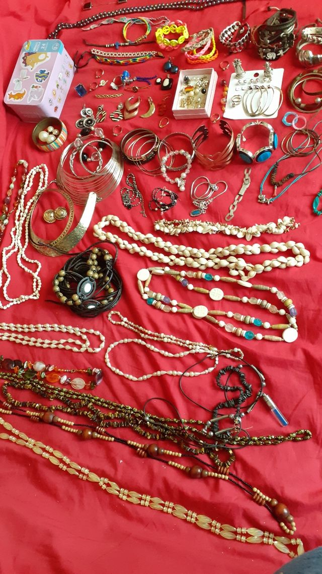 Detalles del productoHay collares largos,colgantes,cortos,de perlas,de colores,pulseras de diversos tipos,algunos anillos,pendientes,diversidad para ocasiones de todo estilo y tipo,variedad,se vende todo el conjunto(preguntar),por separado,por packs,módico precio,personas serias por favor no regalo,preguntar no cuesta nada gracias.