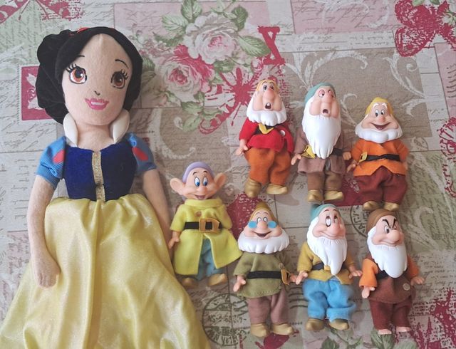 Detalles del productoBlancanieves de peluche de Disney. Los enanitos están completos, excepto de que a Gruñón le faltan sus zapatos. Los enanitos tienen las rodillas articuladas. Son enanitos tipo la barbie de Blancanieves, no figuras. El tul de dentro de la falda de Blancanieves tiene dos agujeritos. Por lo demás están en perfectas condiciones, por eso lo vendo todo a 40.