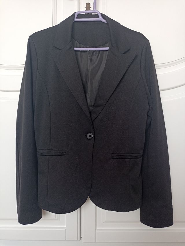 Blazer de mujer en color negro en buen estado. Es cortita, queda a ras de cintura (no llega a tapar el trasero). Talla XS - S. Está forrada en el interior, de tela de raso. Los bolsillos de la parte delantera son decorativos.