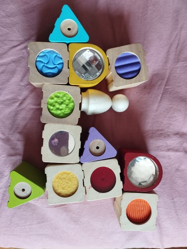Detalles del productoJuguetín de bloques para bebés, ideal para estimular el desarrollo sensorial y la motricidad fina. Los bloques son de madera y presentan diferentes texturas y formas.