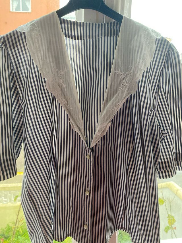 Blusa narinera con el cuello con organza con dibujo con flores blancas y botones blancos de nacar De Algodon