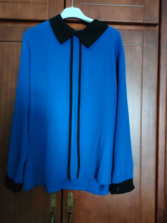 Blusa azul con cuello y puños negros