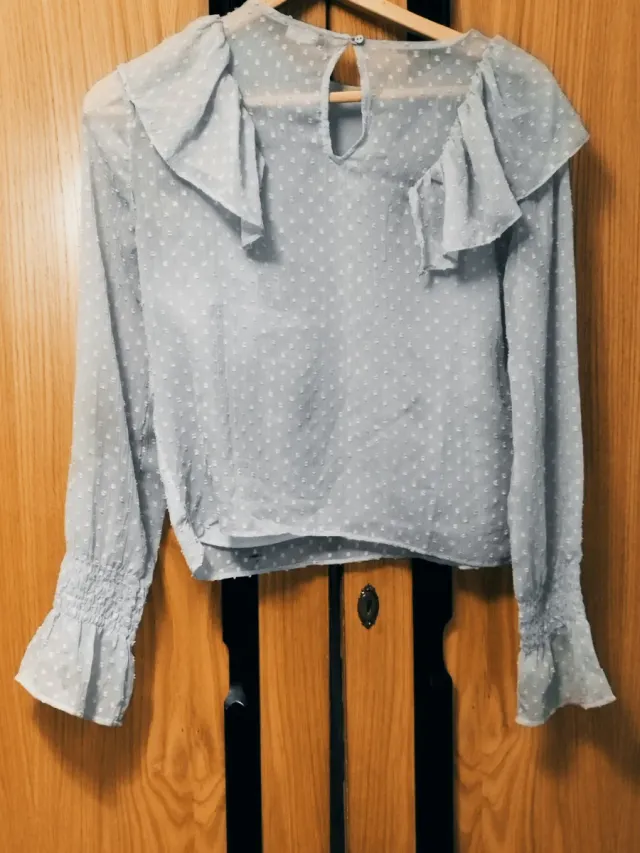 BLUSA BERSHKA S CHIFÓN PLUMETIS VOLANTES AZUL