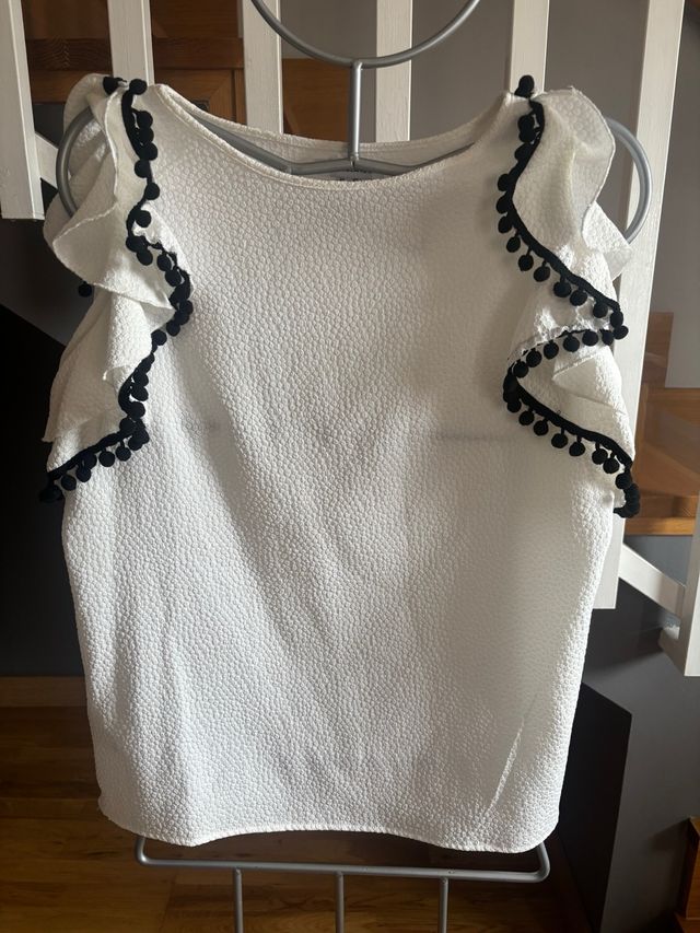 Blusa blanca con volantes y pompones