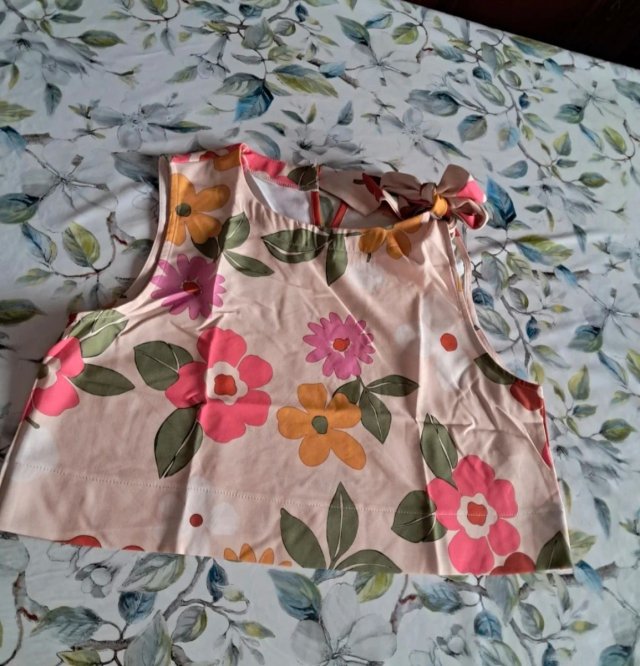Blusa sin mangas con un estampado floral vibrante. El diseño presenta flores en tonos rosas, naranjas y fucsia sobre un fondo claro, con hojas verdes.