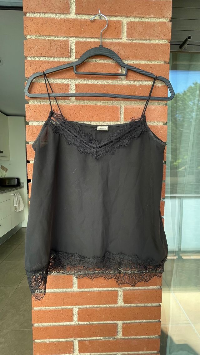 Blusa de estilo lencero de manga de tirantes, en color negro y detalles de encaje negros. Del Pimkie.