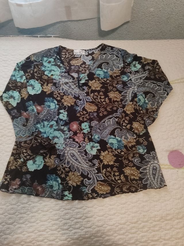 Detalles del productoPreciosa blusa de manga larga con estampado paisley. Es de color negro y turquesa, y tiene una talla 8. La tela es ligera y transparente. - Elegante diseño floral. - Perfecta para cualquier ocasión.