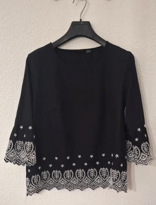 Blusa negra con bordado blanco. Mujer