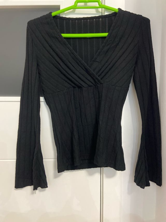 Blusa negra escote pico manga acampanada