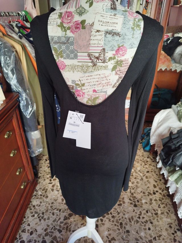 Blusa larga negra viscosa talla 38/40 gran escote detrás o mini vestido más largo por detrás