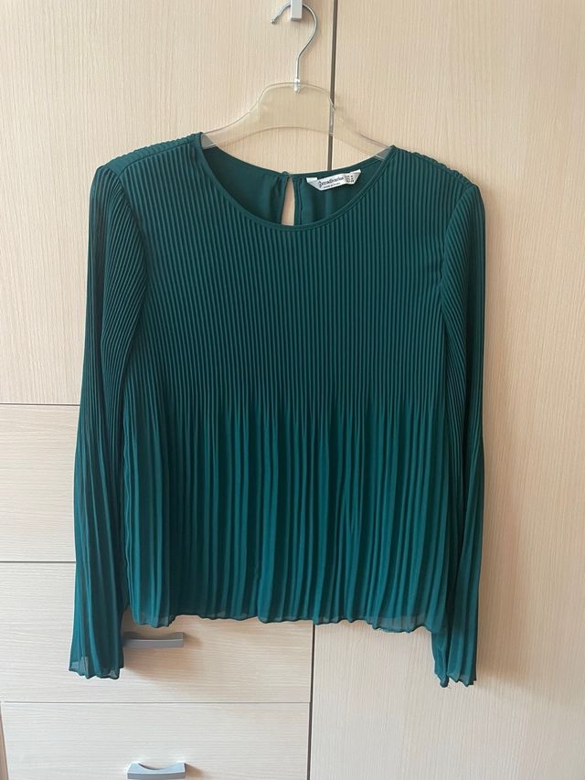 Preciosa blusa de la marca Stradivarius. Es de color verde y tiene un diseño plisado que la hace muy elegante.