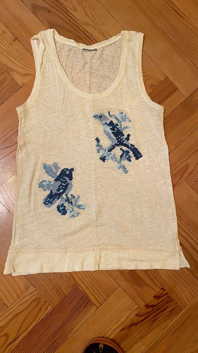 Blusa sin mangas con pájaros bordados.