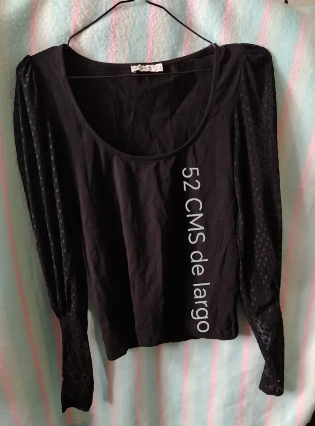 Blusa negra de manga larga con detalles de malla en las mangas.