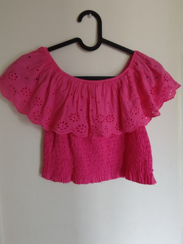 Preciosa blusa fucsia con vuelos. Algodón 100%. Muy buen estado. Largo desde el hombro hasta el ombligo 34 cm y desde el pecho a abajo 27 cm aprox.