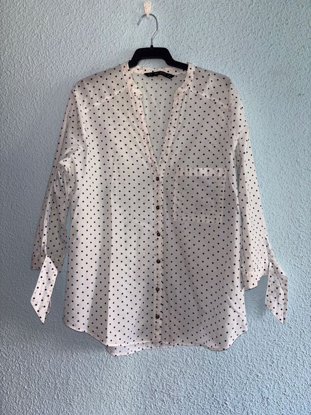 Blusa de Zara con estampado de lunares. Es de manga tres cuartos y tiene un lazo en las mangas.