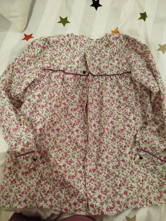 Blusón de fallera con un bonito estampado floral. Presenta un ribete morado y botones oscuros. Talla 12