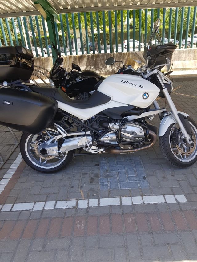Moto BMW R1200R en color blanco y negro. - Moto deportiva. - Incluye maletas laterales BMW. - Top case negro.