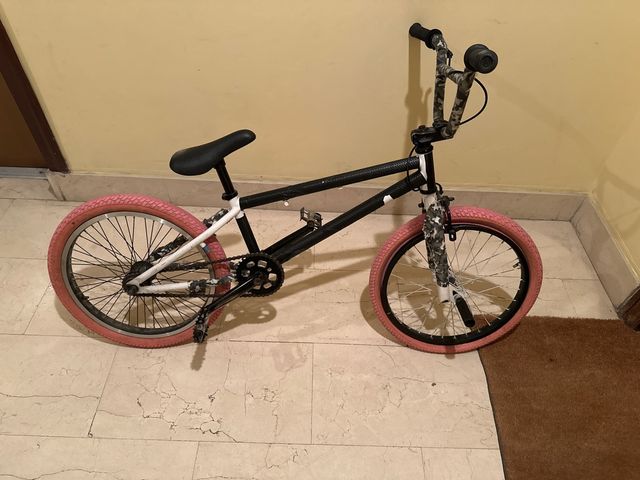 Detalles del productoBicicleta BMX con un diseño llamativo y ruedas de color rosa.