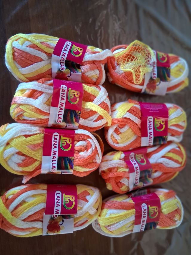 Detalles del productoLote de 8 bobinas de hilo de malla, cada una con un peso de 28 gramos. Los colores son una mezcla vibrante de naranja, amarillo y blanco.