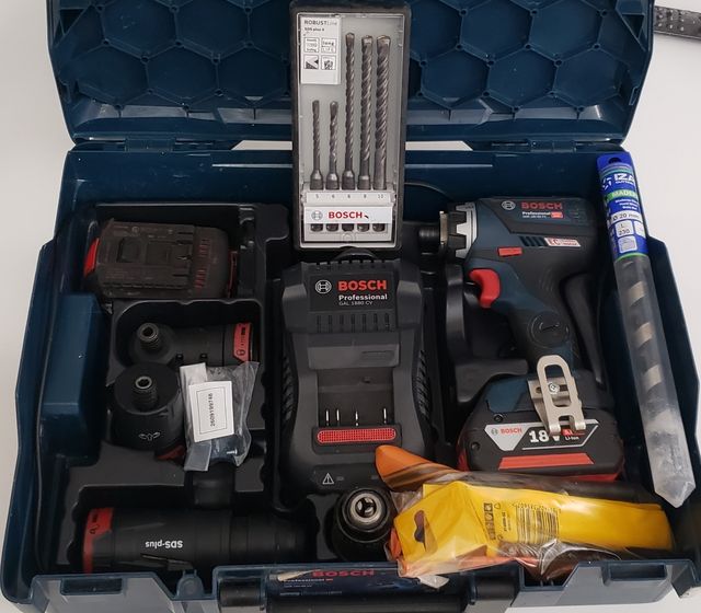 Detalles del productoEl sistema FlexiClick de Bosch Professional:sistema versátil con accesorios fáciles de cambiar, que se pueden colocar en 16 posiciones distintas a 360°, sin quitarlos.Muy Compacta y Potente: cabezal de 136 mm y un par de giro duro máximo de 64 Nm.Las baterías y cargadores son 100 % compatibles con el sistema BPro 18V System y con muchas otras herramientas AMPShar.Accesorio:GSR 18V-90 FC, 1 GFA 18-M, 1 GFA 18-E, 1 GFA 18-W, 1 GFA 18-H, 2 baterías 18V 1x4.0+1x5.0Ah, cargador GAL 1880CV, maletín L-BOXX. Anexo juego de brocas Bosch d concreto,madera y acero + accesorios de corte sisado y puntas dremel y circulares.