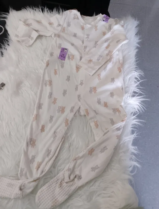 Detalles del productoBody de bebé con estampado de ositos en tonos beige y blanco. Es un mono completo con pies.
