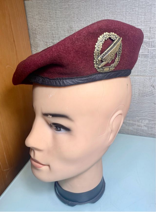Boina roja de la tropa paracaidista del ejercito federal aleman. - Insignia metálica con laurel y águila. - Banda de cuero. - Material textil.