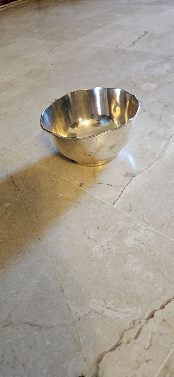 Elegante bol de metal plateado con un diseño único. - Acabado brillante. - Borde con forma ondulada. - Ideal como pieza decorativa o para servir.