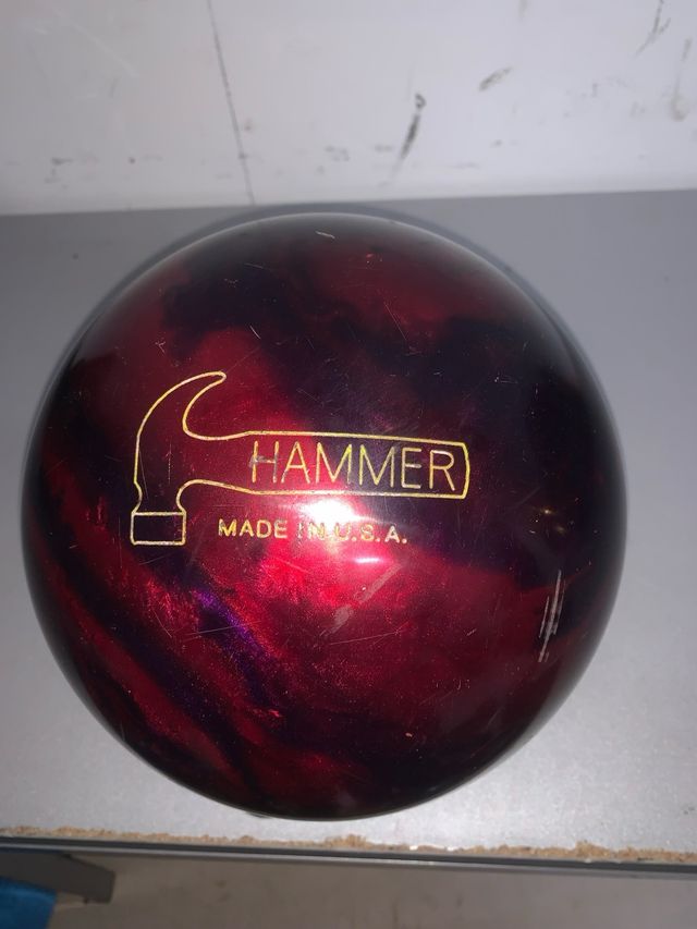 Detalles del productoBola de bolos de la marca Hammer con un peso de 13 libras. Presenta un diseño llamativo en tonos rojos y morados oscuros.