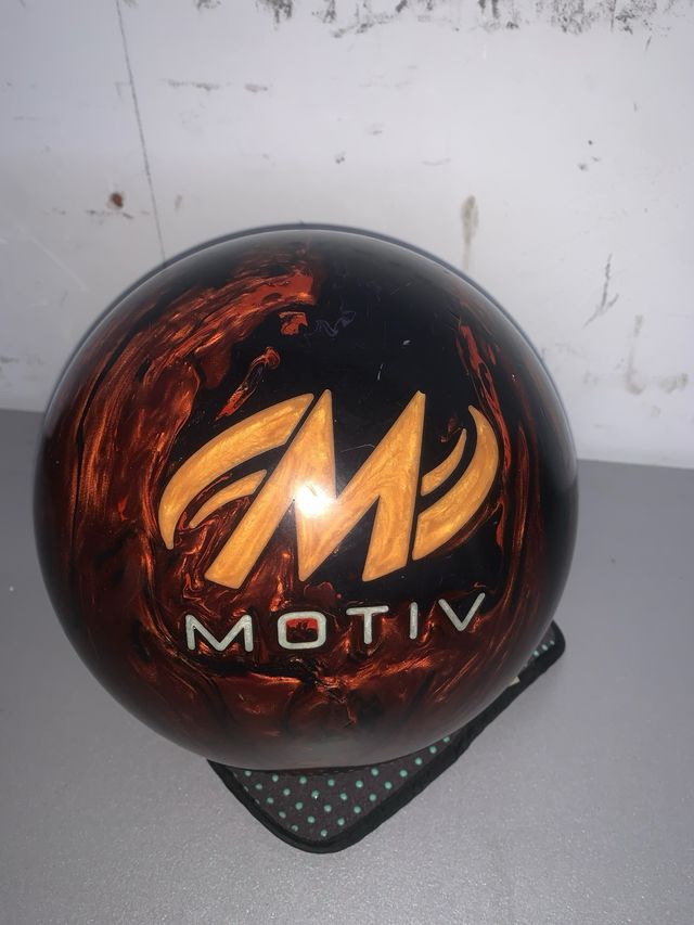 Detalles del productoBola de bolos de la marca Motiv con un peso de 13 libras. Presenta un diseño llamativo en tonos negros y naranjas con remolinos.
