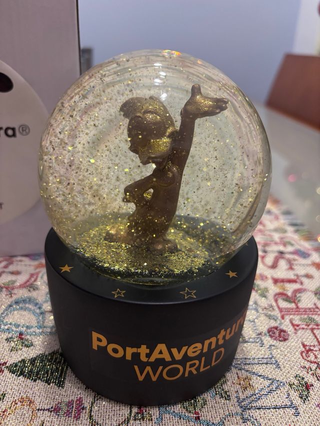Detalles del productoBola de cristal con figura dorada de PortAventura World. Contiene purpurina dorada. Se entrega en su caja original.