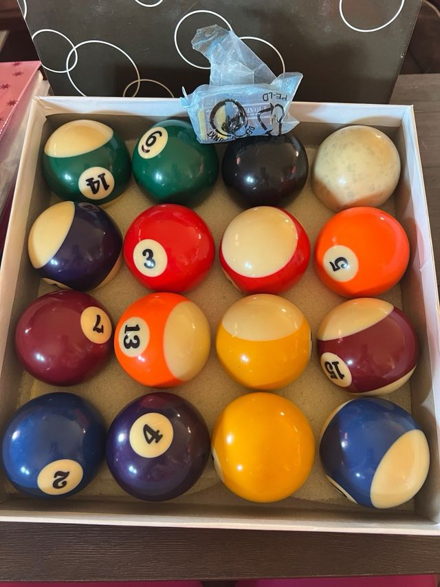 bolas de billar estandar, practicamente nuevas, muy poco uso, con dos tizas para los palos, en su caja original