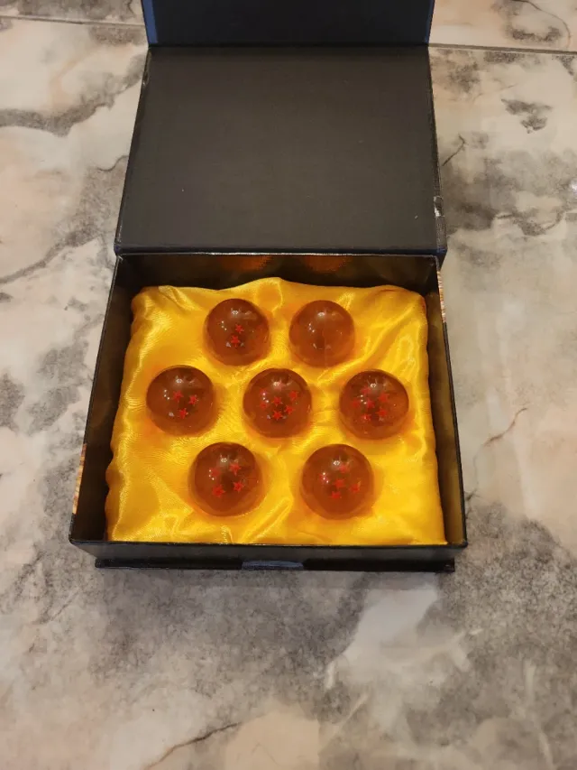 Detalles del productoSet de 7 esferas decorativas inspiradas en las Bolas de Dragón. Cada esfera tiene un color ámbar translúcido y contiene estrellas rojas en su interior.