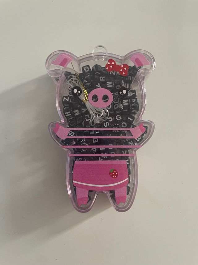 Set de bolas con letras para crear tus propias pulseras y bisutería. Bolas negras con letras blancas. Hilo transparente. No recomendado para niños de menos de 3 años