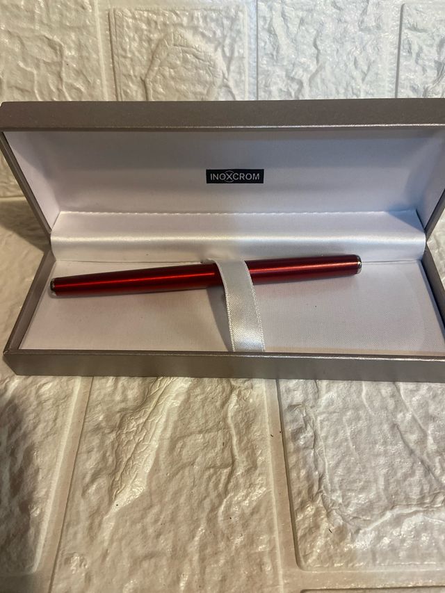 Elegante bolígrafo de la marca Inoxcrom en un llamativo color rojo. Presentado en su caja original. - Diseño metálico. - Incluye cinta de sujeción en la caja.