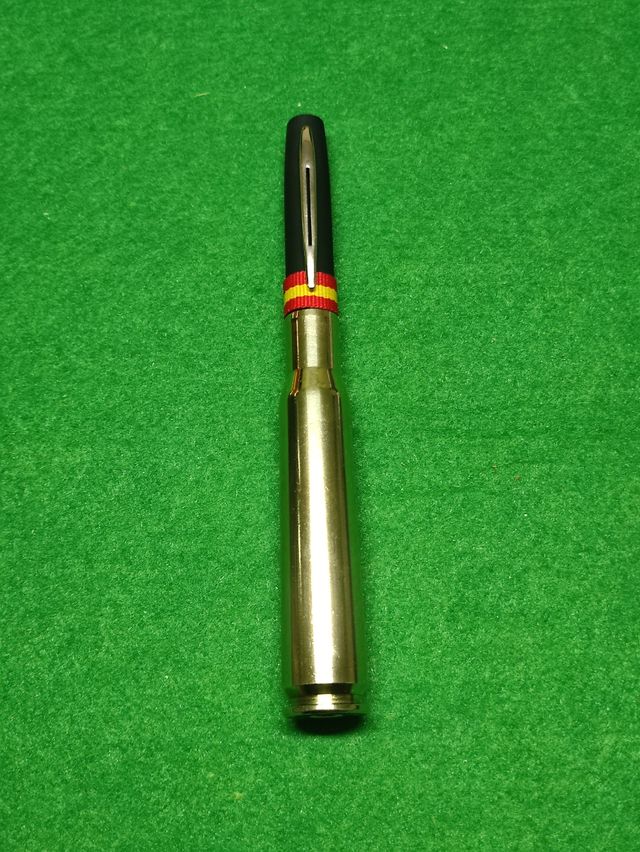 Detalles del productoArtesanía militar de lujo realizado con casquillos reales de ametralladora disparados, limpiados, pulidos y barnizados de calibre 12, 70 en los que se ha ajustado un bolígrafo de gel de alta calidad y capacidad de tinta XL.