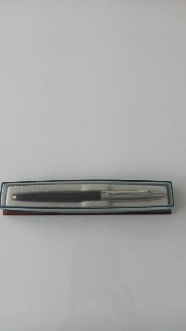 Bolígrafo de la marca Parker, presentado en su estuche. - Diseño elegante en color negro y detalles plateados.